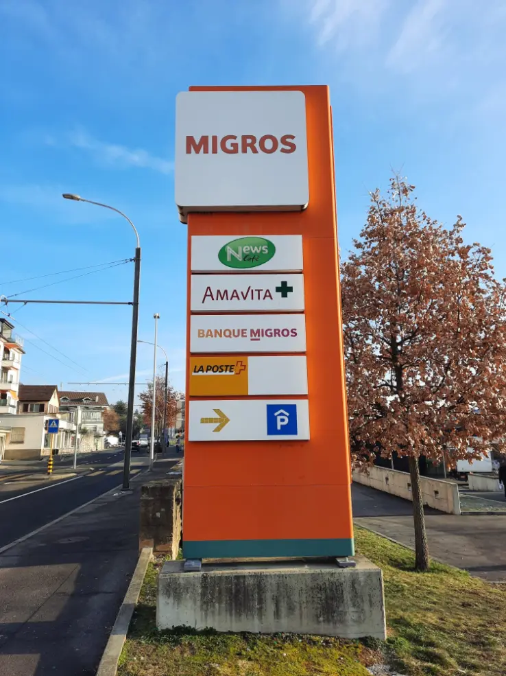 Enseigne sur totem pour Banque Migros