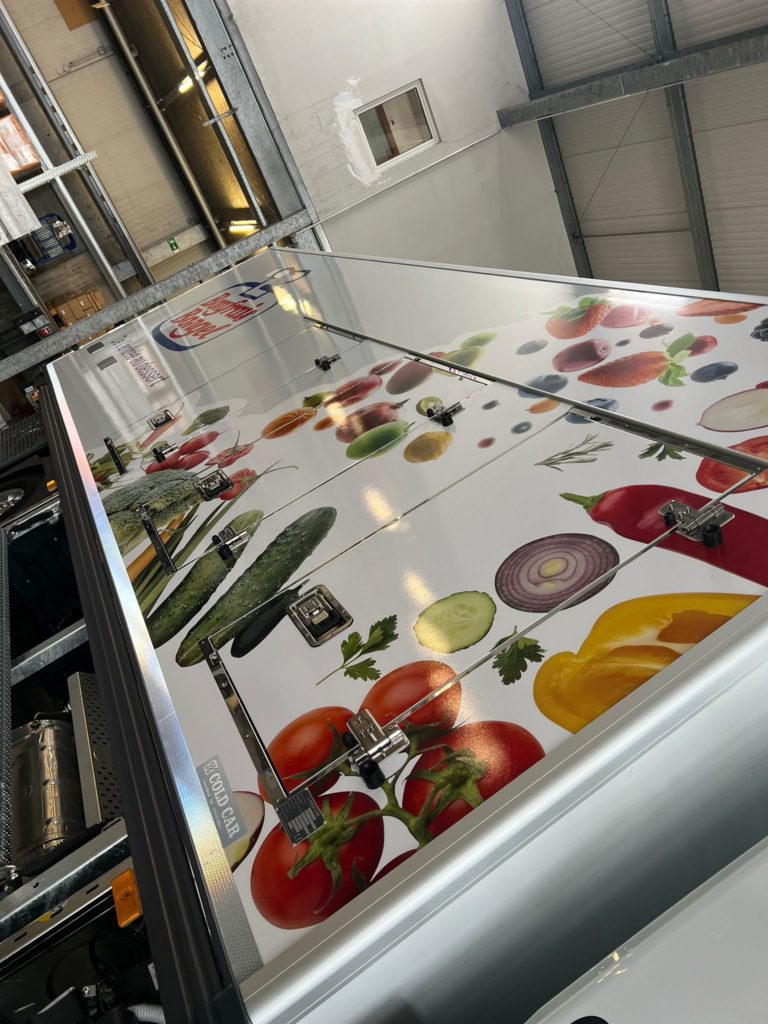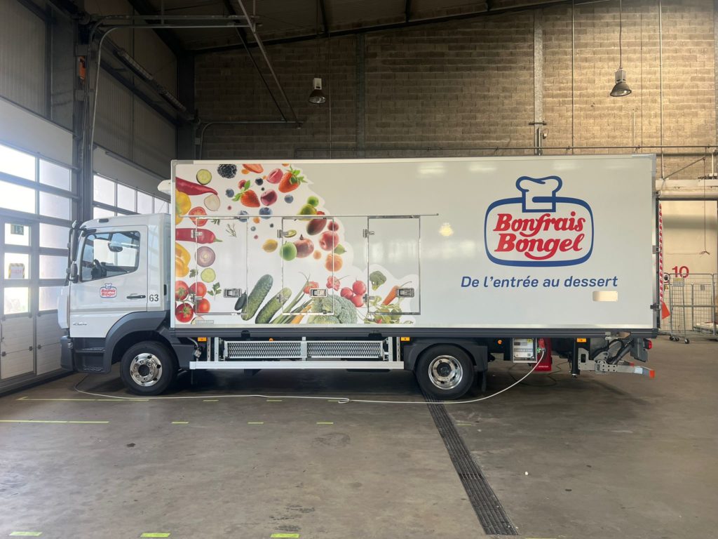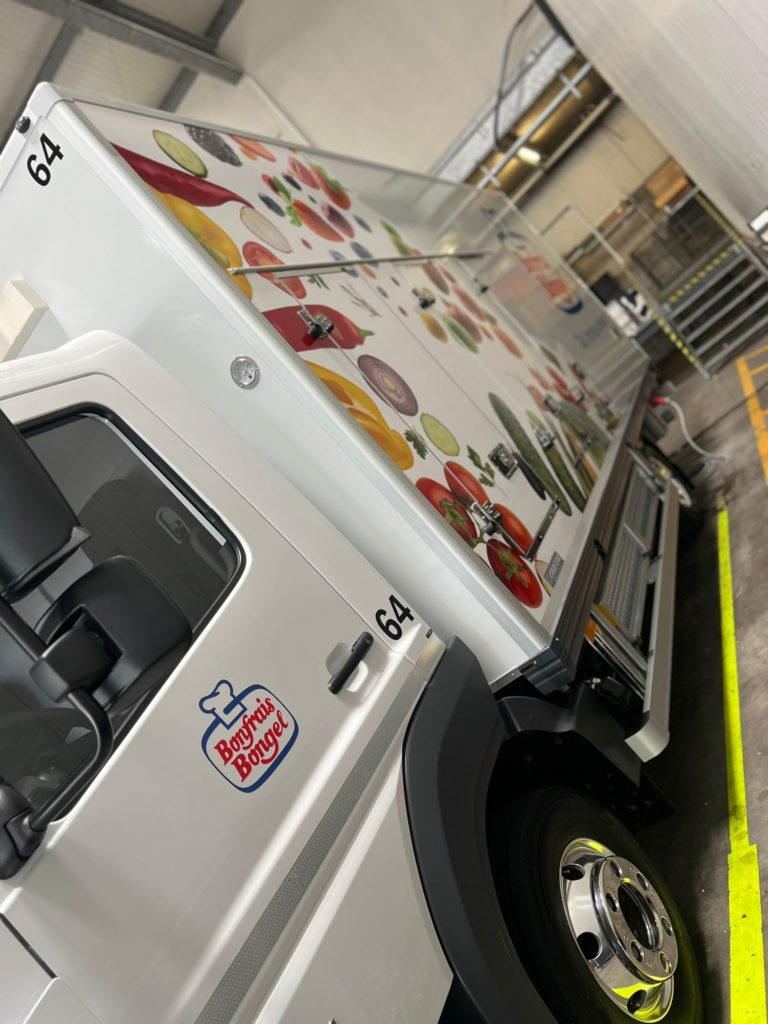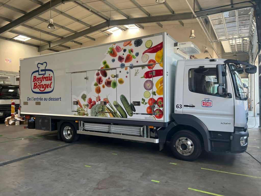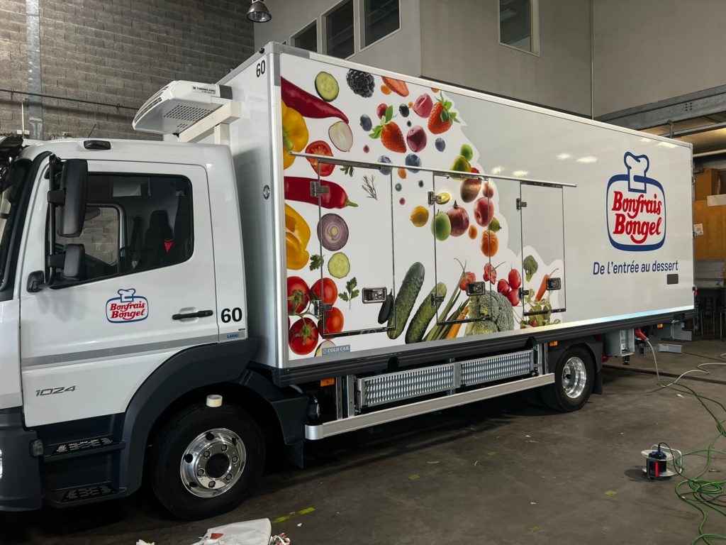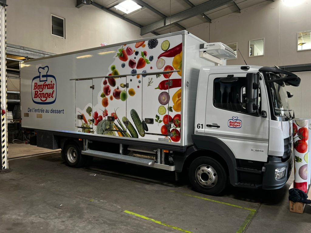 Bonfrais Bongel, acteur majeur de la distribution de produits frais et surgelés, a récemment confié à Nmk-pub l’habillage de sa nouvelle flotte de cinq camions bi-températures . La mission : concevoir des visuels percutants pour chaque véhicule, en intégrant le logo de Bonfrais Bongel et en veillant à une cohérence visuelle sur l’ensemble de la flotte. Les adhésifs ont été posés avec soin , garantissant une finition impeccable et une visibilité maximale sur les routes.
