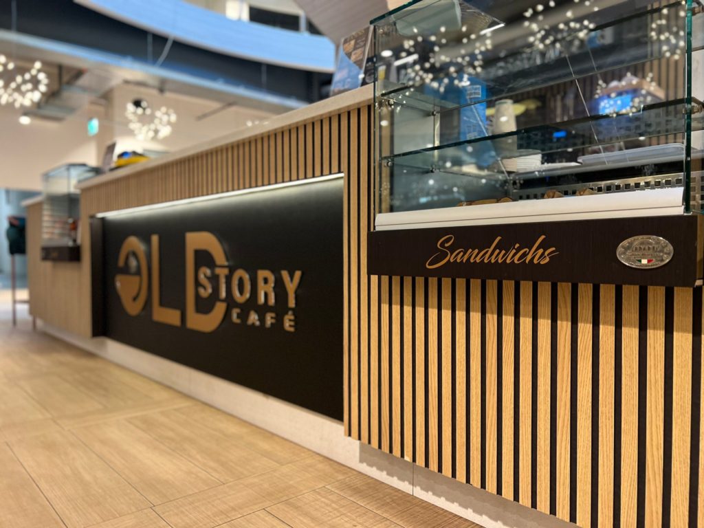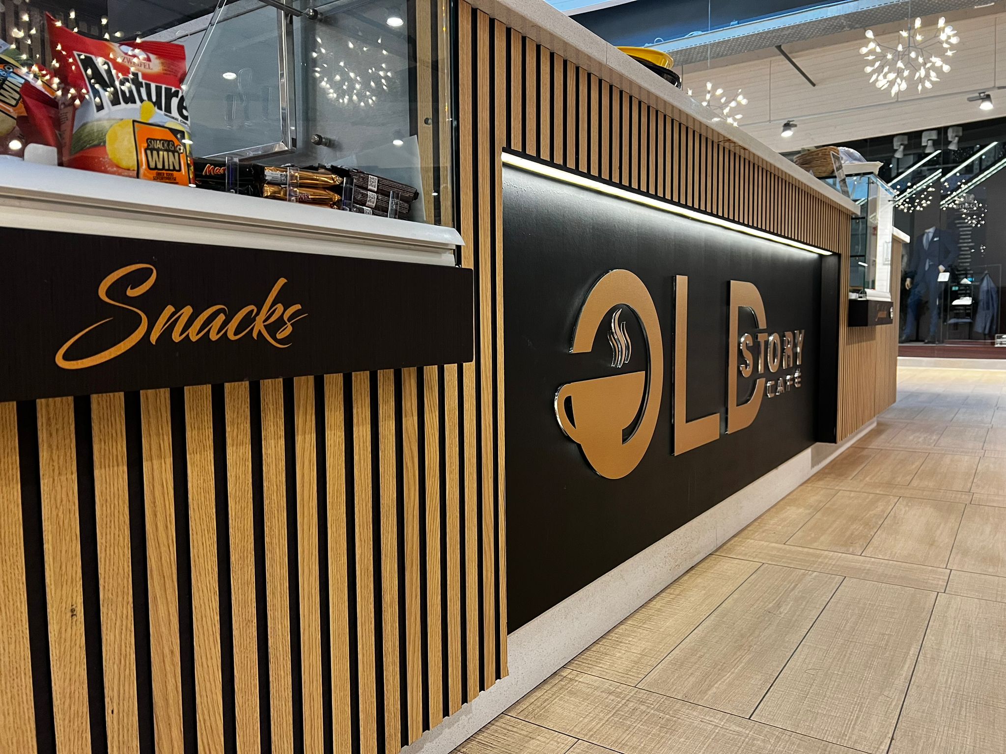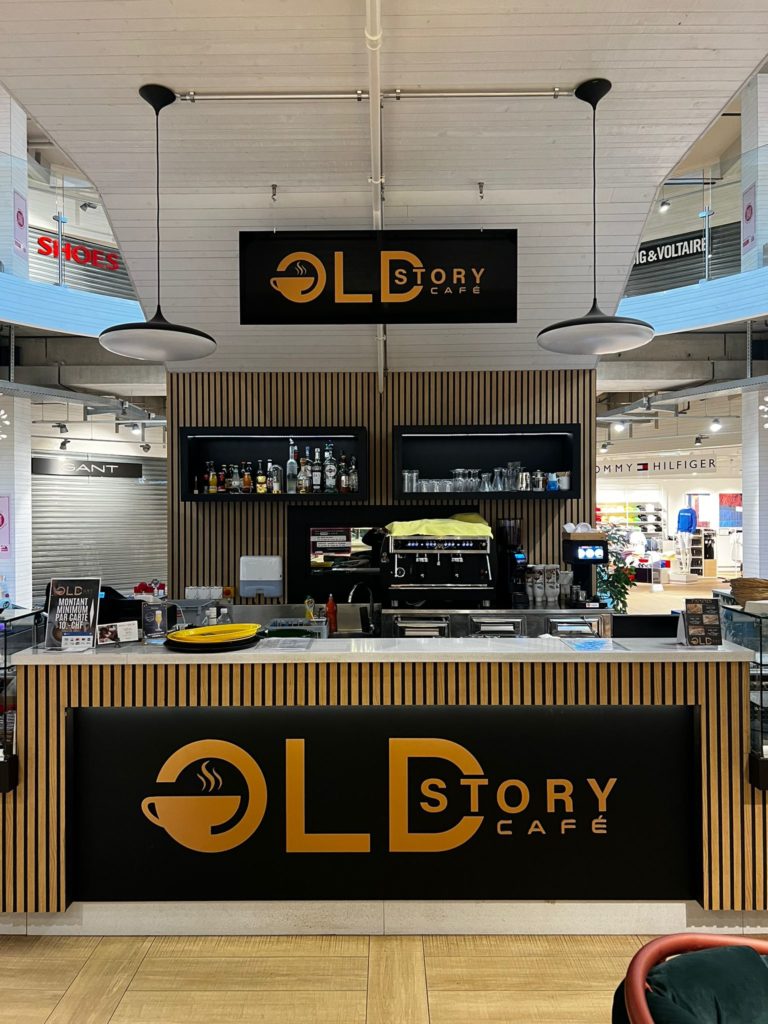 Cet habillage donne une touche moderne et raffinée à l’entrée du Old Story Café, qui se distingue ainsi au sein de l’Outlet – un bel exemple de signalétique temporaire ou permanente adaptée à chaque étape d’un commerce .