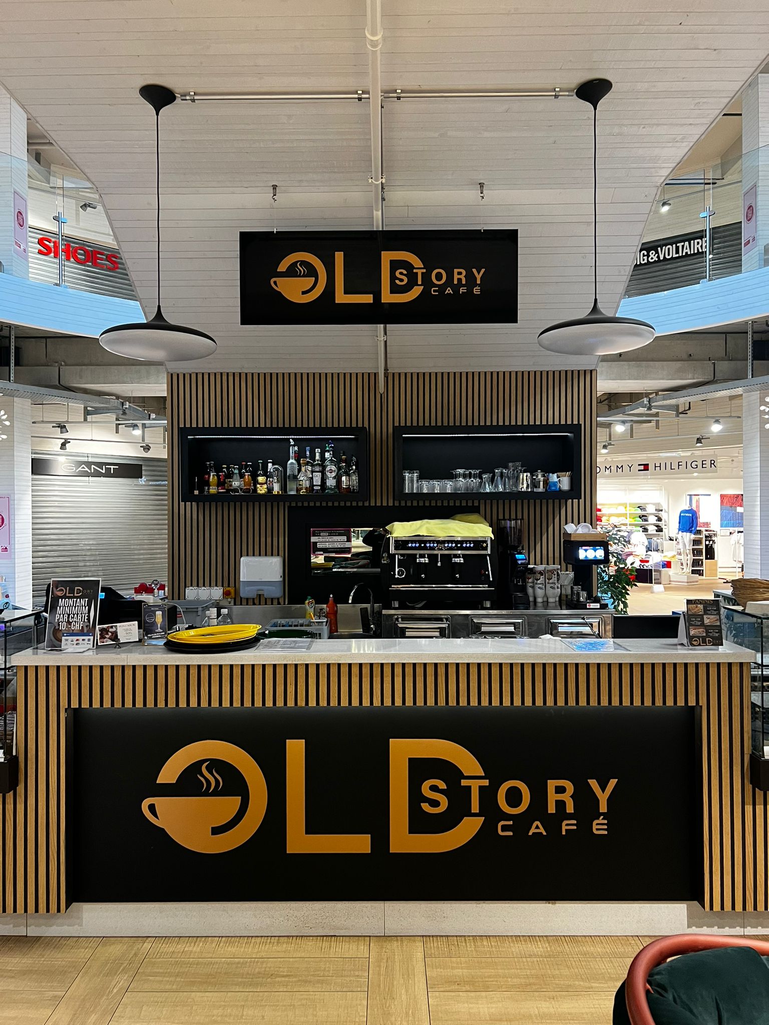 Le Old Story Café, installé au cœur de l’Outlet d’Aubonne, souhaitait se démarquer avec une nouvelle enseigne à la fois élégante et captivante – un projet pris en charge par Nmk-pub, spécialiste en habillage et signalétique .